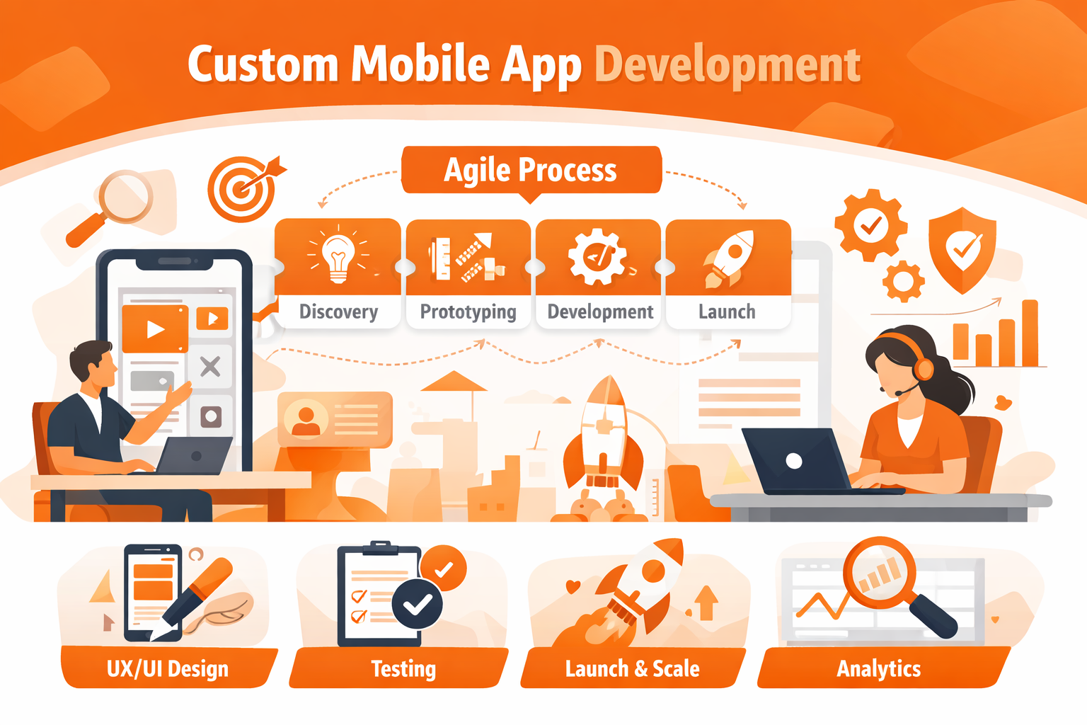 Staged rollout with monitoring, analytics, and performance optimization. Post-launch support and iterative improvements based on real user data.